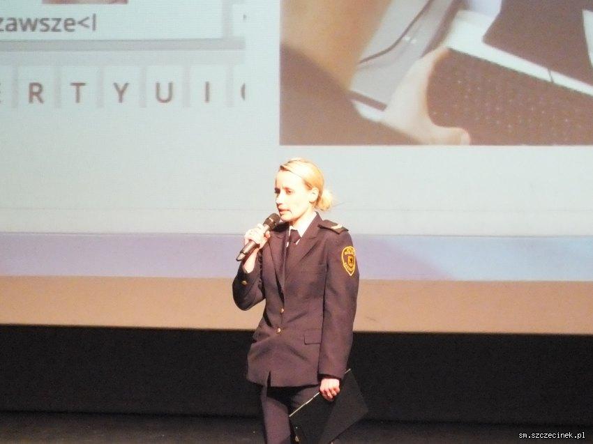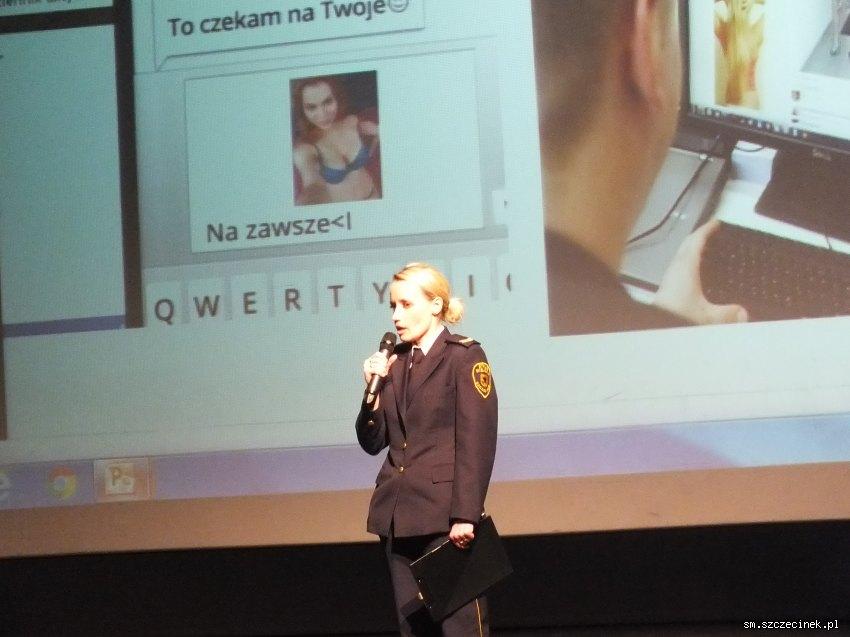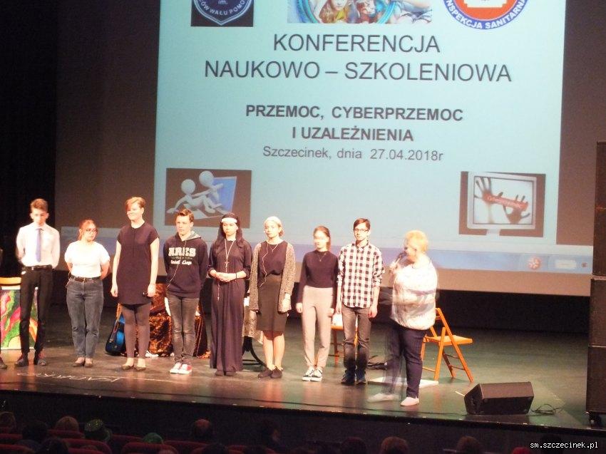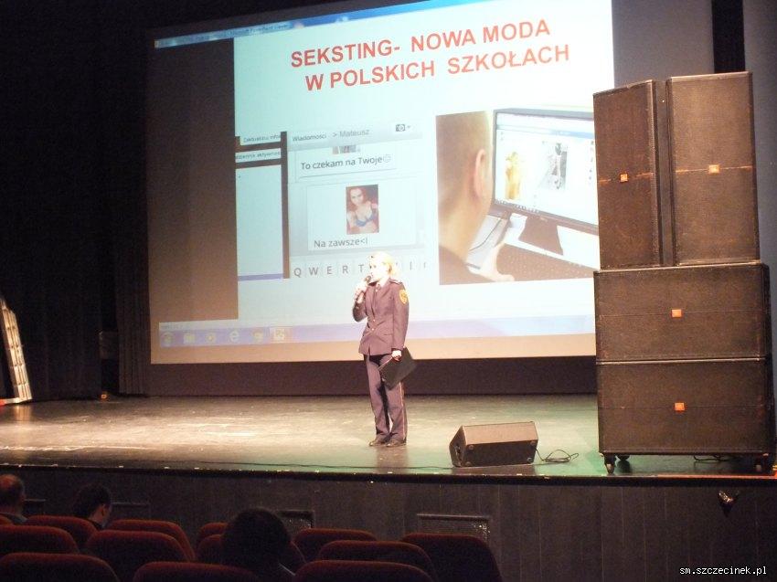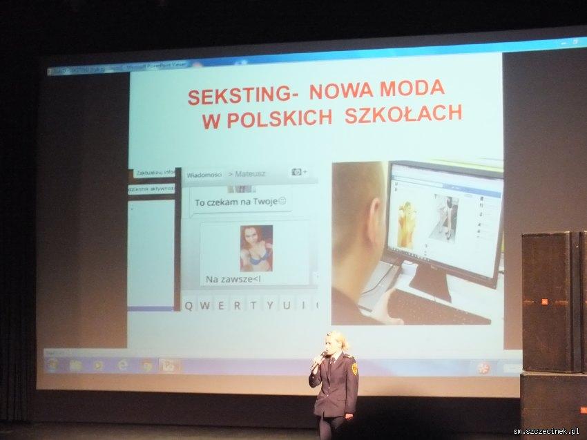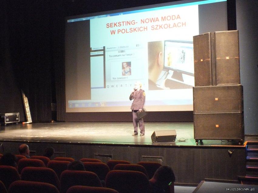 W dniu 27.04. w sali widowiskowej Kina Wolność odbyła się Konferencja Naukowo-Szkoleniowa pod hasłem "Przemoc, cyberprzemoc i uzależnienia", która była skierowana do uczniów klas VII szczecineckich szkół podstawowych oraz powiatowych. Podczas tej konferencji Spec. Paulina Peciak-Nazarewska przeprowadziła wykład na temat zjawiska Sekstingu, czyli tworzenia, przesyłania czy odbierania zdjęć i filmów o charakterze seksualnym z wykorzystaniem nowej technologii np. Internetu, telefonów komórkowych, aplikacji internetowych, videoczatorów. Badania przeprowadzone przez FDN pokazały, że aż 1/3 nastolatków otrzymuje materiały sekstingowe, a 11% czyli co 9- ty młody człowiek sam takie zdjęcia czy filmy wysyła. Strażniczka powiedziała o konsekwencjach z jakimi trzeba się liczyć, kiedy wysyła się taki materiał, ale również o formach pomocy.