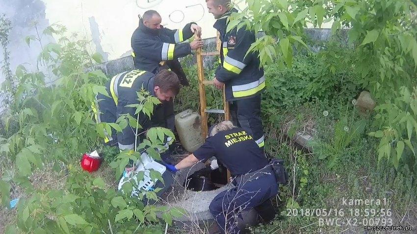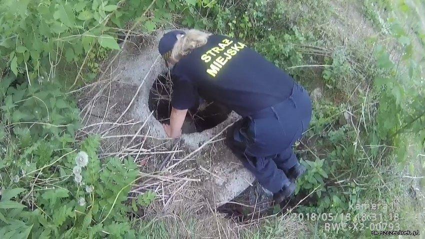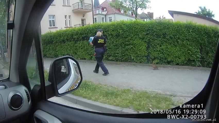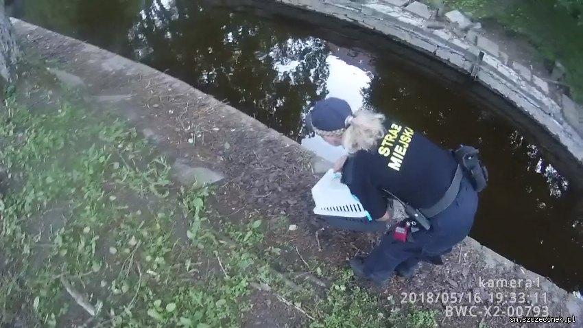 W dniu 16.05. około godziny 18:15 dyżurny otrzymał zgłoszenie, że przy ul. Wyszyńskiego na zapleczu jednego z budynków do niezabezpieczonej studzienki wpadły młode kaczki i nie mogą się wydostać. Na miejsce wysłano patrol jednak ze względu na głębokość studzienki strażniczka i strażnik nie mogli wydostać kaczuszek, na miejsce wezwano zastęp straży pożarnej straży przy użyciu drabiny wyciągnęli kaczuszki. Strażnicy umieścili kaczuszki w klatce. Matki kaczej nie udało się schwytać eskortowano ją pieszo do rzeczki gdzie bezpiecznie odpłynęła z małymi.