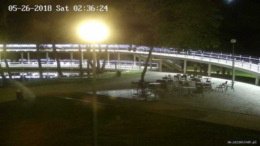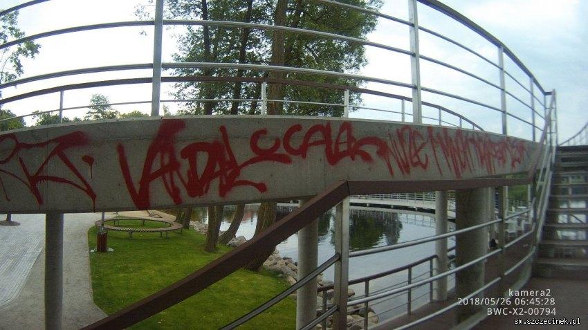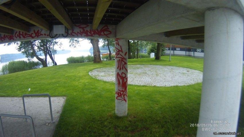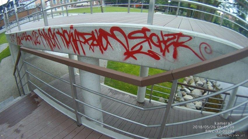 W dniu 26.05. w nocy około godz. 2:40 operator monitoringu miejskiego zauważył na obrazie z kamery przy CK Zamek grupę mężczyzn na pomoście jak malują filary i elewację nowego pomostu sprayem. Na miejsce został wysłany patrol składający się ze strażniczki i policjanta. Przed przejazdem radiowozu mężczyźni uciekli. Na miejscu patrol sprawdził przyległy teren, strażniczka zauważyła jednego ze sprawców, który chował się w krzakach, ujęła go i przekazała policjantowi. Na miejscu funkcjonariusze znaleźli puszkę po sprayu. Mężczyzna został zatrzymany i przewieziony do Komendy Policji. Mężczyzna był już wcześniej zatrzymywany za niszczenie mienia. Dalsze czynności prowadzi Policja.